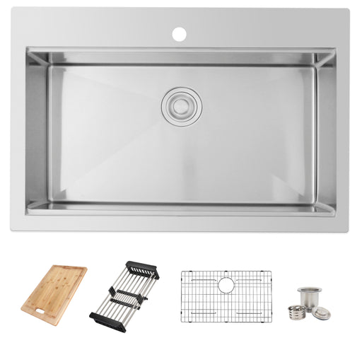 Introducing Azuni’s newest top-mount workstation sink. This stunning 31” x 20.5" single bowl workstation kitchen sink is everything you need for yo...